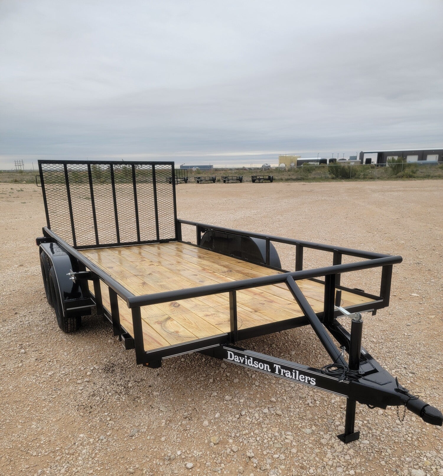 Brand new 2024 Davidson 77"x14' Tandem Axle Trailer. 3,500 lb axles/7,000 GVWR. Pipe top for additional strenth. Treated wood floor. LED lights. 4' removable, reinforced gate or 4' ramp. 2" bulldog hitch.